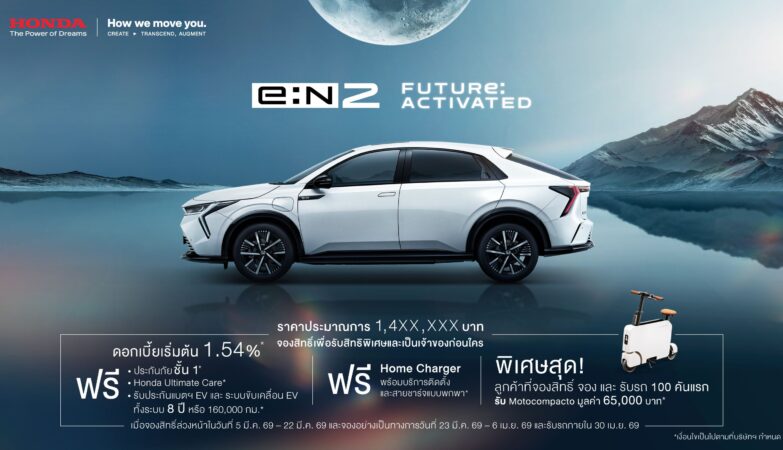 มาแล้ว ! Honda e:N2 SUV ไฟฟ้า 100% รุ่นใหม่ เปิดจองสิทธิ์ 5 – 22 มี.ค. 2569 ด้วยราคาประมาณการ 1.4XX ล้านบาท ดีไซน์สปอร์ต Fastback พร้อมฟีเจอร์พรีเมียม เปิดราคาจริง 23 มี.ค. 2569 และสัมผัสคันจริงในงาน Motor Show 2026 และโชว์รูมฮอนด้า