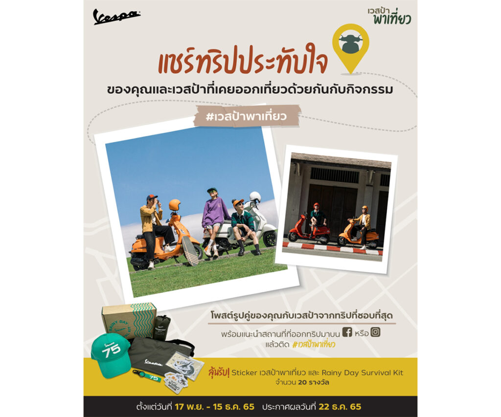 “Vespa” ขอปลุกจิตวิญญาณนักผจญภัยชาวสองล้อสัญชาติอิตาเลียนขึ้นมาอีกครั้งผ่านแคมเปญ “#เวสป้าพาเที่ยว” เชิญชวนชาว Vespa ทุกคนได้ออกไปใช้ชีวิตในแบบที่ใจต้องการ อย่างอิสระ พร้อมร่วมสนุกกับกิจกรรมที่จัดขึ้นเพื่อชาว Vespa เพียงแค่แชร์ทริปที่ประทับใจของคุณและเวสป้าคันโปรดที่เคยออกเที่ยวด้วยกันบน Facebook และ Instagram พร้อมติด Hashtag #เวสป้าพาเที่ยว เพียงเท่านี้ก็สามารถเป็นผู้โชคดี รับ Sticker เวสป้าพาเที่ยว และ Rainy Day Survival Kit จำนวน 20 รางวัล เตรียมพร้อมออกทริปถัดไปอย่างมีสไตล์ สามารถร่วมกิจกรรมได้ตั้งแต่วันนี้ ถึง 15 ธ.ค. 2565 ประกาศผลวันที่ 22 ธ.ค. 2565 ผ่านช่องทาง https://www.facebook.com/vespathailand