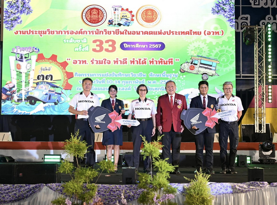 ไทยฮอนด้า ผู้ผลิตและจัดจำหน่ายรถจักรยานยนต์และเครื่องยนต์อเนกประสงค์ฮอนด้าในประเทศไทย นำโดย ดร.อารักษ์ พรประภา ประธานบริษัท ไทยฮอนด้า จำกัด เข้ารับโล่รางวัลประกาศเกียรติคุณภาคีเครือข่ายภาคเอกชน จาก นายยศพล เวณุโกเศศ เลขาธิการคณะกรรมการการอาชีวศึกษา ในพิธีเปิดงานประชุมวิชาการองค์การนักวิชาชีพในอนาคตแห่งประเทศไทย (อวท.) ระดับชาติ ครั้งที่ 33 ซึ่งจัดขึ้น ณ เวทีโดมอเนกประสงค์ วิทยาลัยเทคนิคตรัง จังหวัดตรัง เมื่อเร็วๆ นี้