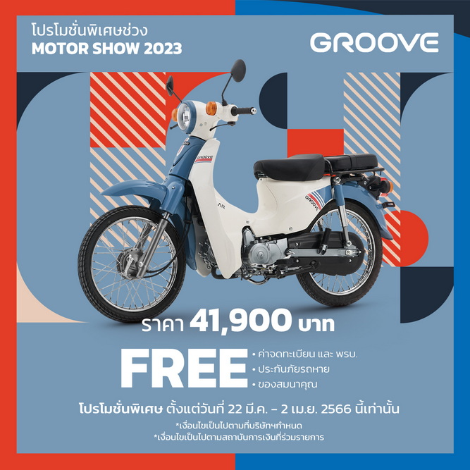 - GROOVE CROSS 125 : ได้เวลาออกนอกเส้นทาง…พร้อมที่จะเปลี่ยนรูปแบบการเดินทางแบบเดิมๆให้แตกต่าง ด้วยดีไซน์ตกแต่งพิเศษ ดุดันสายลุยตัวจริง มาพร้อมฟังก์ชั่นที่ตอบโจทย์ผู้ชื่นชอบการเดินทางด้วยโช้คอัพยกสูง ราคาสุดพิเศษที่ 43,900 บาท ฟรี!!! ค่าจดทะเบียน พรบ.และประกันรถหาย พร้อมของสมนาคุณ
