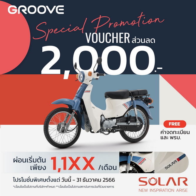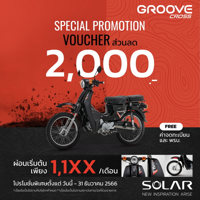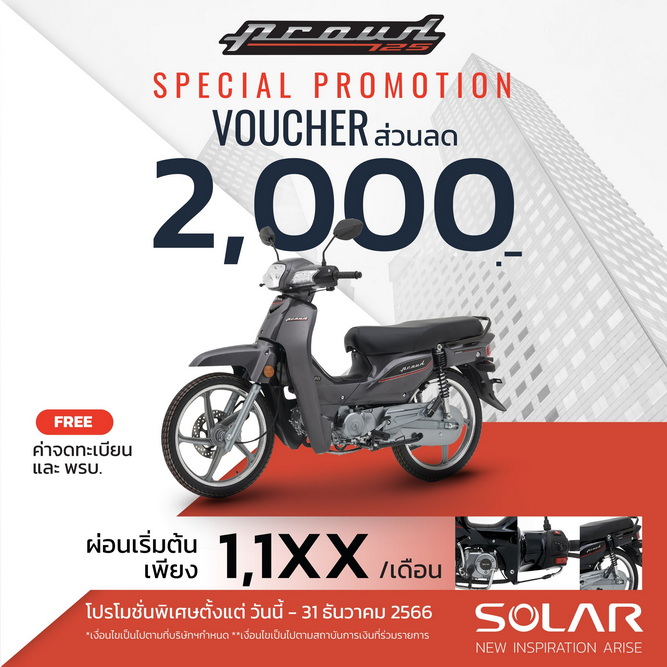 SOLAR มาพร้อมคอนเซ็ปต์ “NEW INSPIRATION ARISE” กำเนิดใหม่ของแรงบันดาลใจ เสมือนแสงอาทิตย์แรกของทุกวันที่สะท้อนให้เกิดพลังขับเคลื่อนยานยนต์สองล้อสไตล์ใหม่ ที่มีมาให้เลือกถึง 3 สไตล์ด้วยกัน ไม่ว่าจะเป็น PROUD, GROOVE URBAN และ GROOVE CROSS ด้วยคาแรคเตอร์ที่ชัดเจน ดีไซน์โดดเด่น ตอบโจทย์ไลฟ์สไตล์ที่ไม่เหมือนใคร มาร่วมค้นหาแรงบันดาลใจใหม่ด้วยข้อเสนอสุดพิเศษ ทุกรุ่น ทุกสไตล์ รับทันที VOUCHER ส่วนลด 2,000 บาท ฟรี!!! ค่าจดทะเบียน พรบ. และผ่อนเริ่มต้นเพียง 1,1XX บาท/เดือน เท่านั้น ตั้งแต่วันนี้จนถึง 31 ธันวาคม 2566