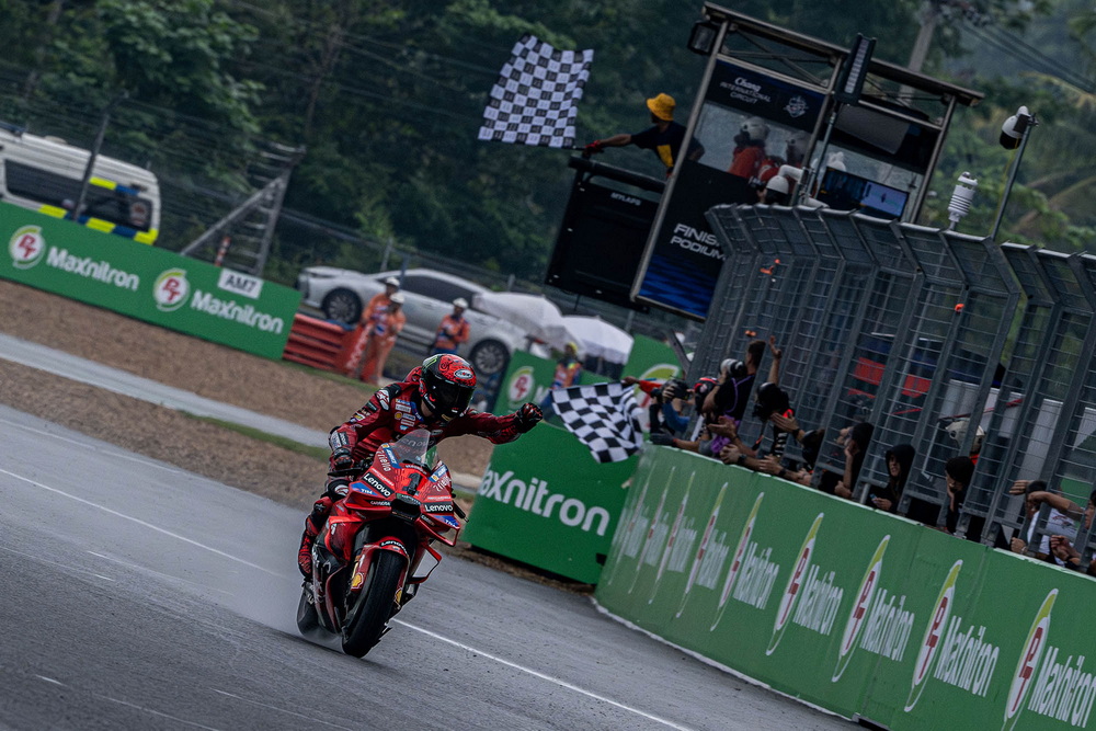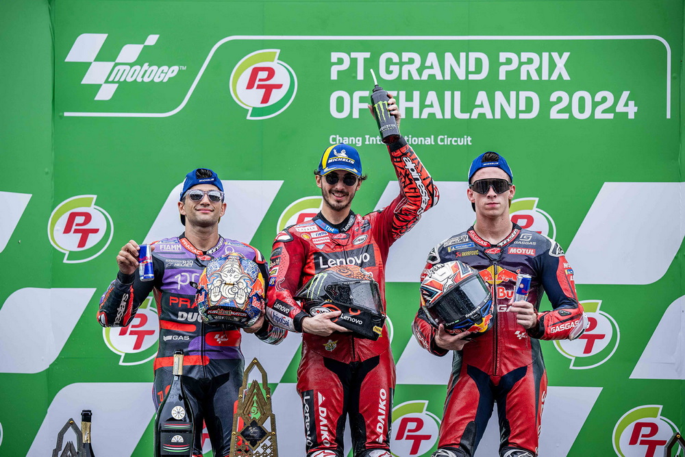 ศึก โมโตจีพี สนามประเทศไทย รายการ PT Grand Prix of Thailand 2024 ประสบความสำเร็จยิ่งใหญ่ ขณะเกมการแข่งขันเข้มข้นระดับ 5 ดาว ท่ามกลางแฟนความเร็วตลอด 3 วันมากถึง 205,343 คน ผลรุ่นใหญ่ “ฟรานเชสโก้ บันยาญ่า”แชมป์โลก 2 สมัยชาวอิตาเลียนจาก ดูคาติ เข้าวินพร้อมตีตื้น “ฮอร์เก มาร์ติน” คู่แข่งชาวสแปนิชจาก พรามัค เรซซิ่ง เหลือ 17 คะแนน ขณะ “ก้อง” สมเกียรติ จันทรา ฮีโร่นักบิดชาวไทยจาก อิเดมิตสึ ฮอนด้า ทีม เอเชีย สร้างผลงานสุดประทับใจ สตาร์ตกริด 13 แซงคว้าท็อป 4 ในรุ่น โมโตทู ส่วน “ไอ โอกูระ” นักบิดญี่ปุ่นได้ฉลองแชมป์อย่างยิ่งใหญ่กับแฟนชาวไทยที่ บุรีรัมย์