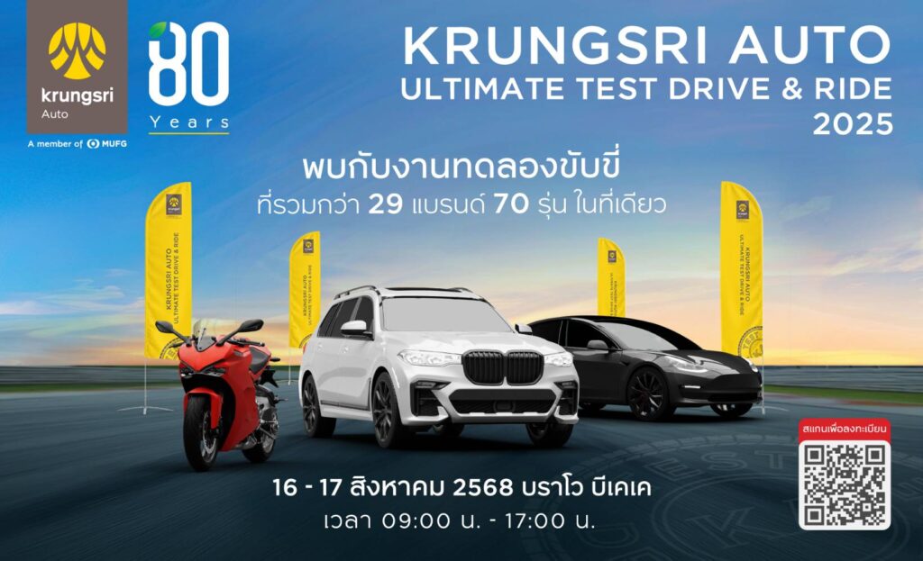 ลูกค้าปัจจุบัน กรุงศรี ออโต้ และผู้ที่สนใจสามารถเข้าร่วมงาน “Krungsri Auto Ultimate Test Drive & Ride 2025” ได้ระหว่างวันที่ 16 – 17 สิงหาคม 2568 เวลา 09:00 – 17:00 น. ณ บราโว บีเคเค (Bravo BKK) โดยสามารถลงทะเบียนเข้าร่วมงานได้ ตั้งแต่วันที่ 30 กรกฎาคม – 13 สิงหาคม 2568 ติดตามรายละเอียดเพิ่มเติมได้ที่ https://www.krungsriauto.com/auto/Promotion/ultimate_testdrive.html
