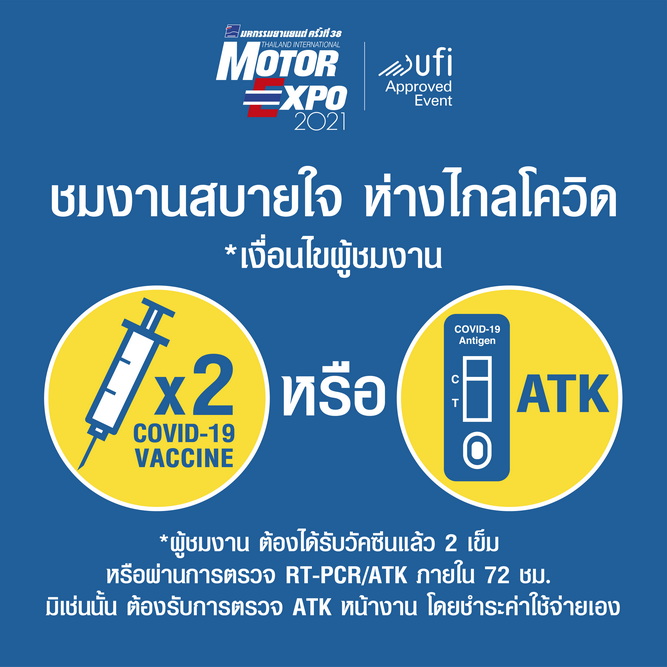 ขวัญชัย ปภัสร์พงษ์ ประธานจัดงาน “มหกรรมยานยนต์ ครั้งที่ 38” เปิดเผยว่า “ขณะนี้ผ่านครึ่งทางการจัดงานด้วยความราบรื่น ทุกฝ่ายที่เกี่ยวข้องให้ความร่วมมือ ปฏิบัติตามมาตรการป้องกันการแพร่ระบาดของ COVID-19 อย่างเคร่งครัด รวมถึงผู้เข้าชมงานก็ให้ความร่วมมือเป็นอย่างดี ถึงแม้จะมีขั้นตอนการเข้าชมเพิ่มขึ้น ทั้งนี้ต้องขอขอบคุณภาครัฐและทุกหน่วยงาน ที่ให้คำปรึกษาแนะนำเรื่องการกำหนดมาตรการต่างๆ ตลอดจนพันธมิตร Finno-Health ที่ให้บริการตรวจ ATK ผู้เกี่ยวข้องในการจัดงานทุก 7 วัน และ โรงพยาบาลบางประกอก 9 สนับสนุนตรวจ ATK ผู้เข้าชมงานทั่วไปที่ยังรับวัคซีนไม่ครบ 2 เข็ม ในราคาพิเศษเพียง 99 บาท”