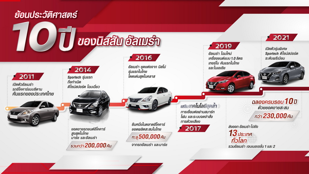 ตลอด 10 ปีที่ผ่านมา นิสสัน อัลเมร่า ในประเทศไทย มีช่วงเวลาที่น่าจดจำมากมาย และนี่คือไฮไลท์สำคัญ: