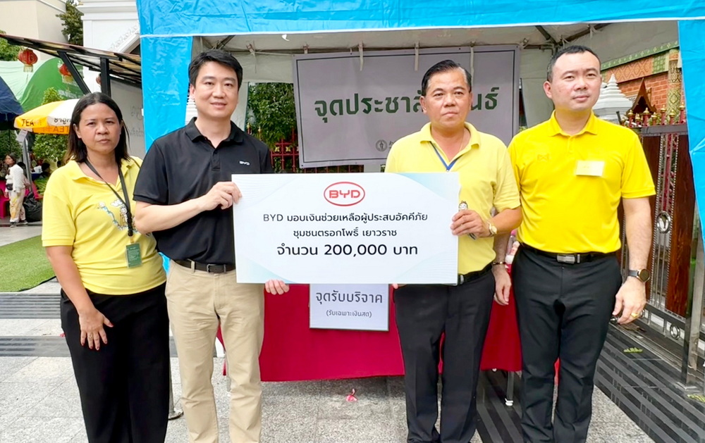 บริษัท บีวายดี ออโต้ (ประเทศไทย) จำกัด ได้ทำการมอบเงินช่วยเหลือผู้ประสบอัคคีภัยในชุมชนตรอกโพธิ์ เยาวราช จำนวน 200,000 บาท โดยมี นายประวิทย์ วิจิตรธนกูล ผู้จัดการฝ่ายการพาณิชย์ บริษัท บีวายดี ออโต้ (ประเทศไทย) จำกัด ตัวแทนจากบริษัทฯ เป็นผู้ส่งมอบเงินช่วยเหลือในครั้งนี้ โดยมีนายวัลลภ เกียรติวรศรีกุล ผู้อำนวยการเขตสัมพันธวงศ์ เป็นผู้รับมอบ