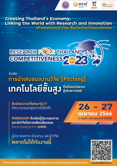 พร้อมนำเสนอผลงาน ภายใน บพข. สร้างสรรค์เศรษฐกิจไทย เชื่อมโลกด้วยวิจัยและนวัตกรรม หรือ “PMUC RESERCH for Thailand’s Competitiveness 2023 ” ที่ บพข.จะจัดขึ้นอย่างยิ่งใหญ่เป็นครั้งแรก ระหว่างวันที่ 26-27 เมษายน นี้ ที่ศูนย์การประชุมแห่งชาติสิริกิติ์