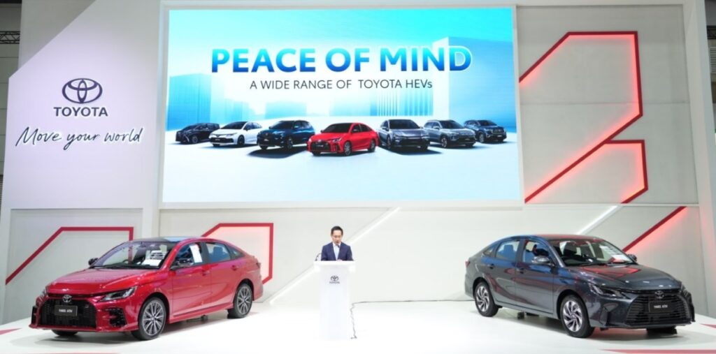 นายศุภกร รัตนวราหะ รองกรรมการผู้จัดการใหญ่ บริษัท โตโยต้า มอเตอร์ ประเทศไทย จำกัด กล่าวเปิดบูธโตโยต้าว่า “ ปีนี้ เรานำเสนอรถยนต์หลากหลายรุ่น ข้อเสนอสุดพิเศษ และบริการตลอดอายุการใช้งานแบบครบวงจร นำโดย YARIS ATIV HEV รุ่นใหม่ ที่เพิ่งเปิดตัวอย่างเป็นทางการ กับ 2 รุ่นย่อย คือ รุ่น HEV Premium ที่มาพร้อม ขุมพลังเครื่องยนต์ไฮบริด ขนาด 1.5 ลิตร ประหยัดสูงสุด ด้วยอัตราการใช้เชื้อเพลิง 29.4 กม. ต่อลิตร และมาตรฐานความปลอดภัยครบครันและรุ่น HEV GR Sport ปรับจูนช่วงล่างพิเศษ ให้ขับสนุก พร้อมการตกแต่งแนวสปอร์ต ทั้งภายในและภายนอก อีกทั้งยังมีรถยนต์ไฮบริด อีกหลายรุ่น ที่เรานำมาให้ทุกท่านได้สัมผัสภายในงาน เช่น CAMRY และ COROLLA ALTIS HEV GR SPORT SUV ยอดนิยม ทั้ง Yaris Cross และ Corolla Cross รถยนต์อเนกประสงค์ 7 ที่นั่ง INNOVA ZENIX และ MPV สุดหรู Alphard โดยลูกค้าทุกท่านสามารถมั่นใจในรถยนต์ไฮบริดทุกรุ่นจากโตโยต้าด้วยการรับประกันแบตเตอรี่ไฮบริดยาวนานถึง 10 ปี