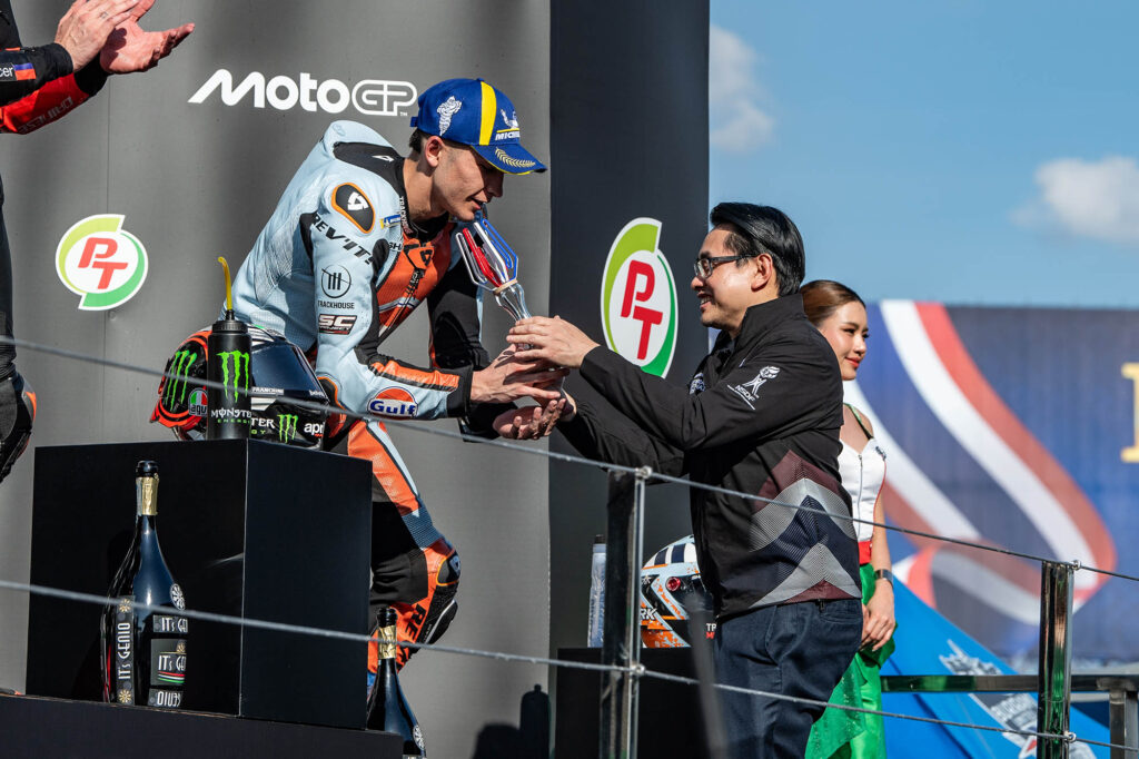 ศึกมอเตอร์สปอร์ตสองล้อเบอร์หนึ่งของโลก “โมโตจีพี” ดวลความเร็วสนามแรก ที่ประเทศไทย ภายใต้ชื่อรายการ “พีที กรังด์ปรีซ์ ออฟ ไทยแลนด์” กระหึ่มโลก ด้วยเกมสุดเร้าใจ มาร์โก เบซเซ็คคี ดาวบิดอิตาเลียนจาก อพริเลีย เรซซิ่ง แก้ตัวสำเร็จนำม้วนเดียวจบผงาดคว้าชัยประเดิมฤดูกาลใหม่เหนือ เปโดร อคอสต้า นักบิดสแปนิชจาก เคทีเอ็ม ขณะ มาร์ค มาร์เกซ แชมป์โลกคนปัจจุบันจาก ดูคาติ ดวงแตกยางระเบิดไม่จบเรซ โดยโมโตจีพี สนามประเทศไทยในครั้งนี้ เป็นปีที่ ทำลายสถิติ (Break Records ) ผู้ชมสูงสุดกว่าทุกปี จำนวนกว่า 228,228 คน