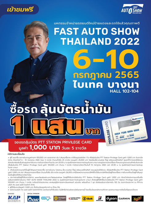 สิ้นสุดการรอคอย! สำหรับคนรักรถยนต์ งาน ฟาสต์ ออโต โชว์ ไทยแลนด์ 2022 กลับมาพร้อมความยิ่งใหญ่ภายใต้สโลแกน “เลือกคันที่ชอบ ถอยคันที่ใช่” ปลดล็อกทุกพันธนาการ จัดทัพรถยนต์ใหม่ป้ายแดงชั้นนำ พร้อมด้วยรถยนต์ใช้แล้วคุณภาพเยี่ยม เตรียมประชันแบบหมดหน้าตักให้กระหึ่ม กึกก้อง โดยมี ผู้สนับสนุนอย่างเป็นทางการคับคั่ง อาทิ OR, กรุงศรีออโต้, อ็อคชั่น เอ็กซ์เพรส, B-Quik, บริดจสโตน, Dyson, Garmin, Meguiar’s ดีเดย์พร้อมเปิดตัวอย่างเป็นทางการ ในวันที่ 6-10 กรกฎาคม นี้ ณ ศูนย์นิทรรศการและการประชุมไบเทค บางนา ฮอลล์ EH102-104