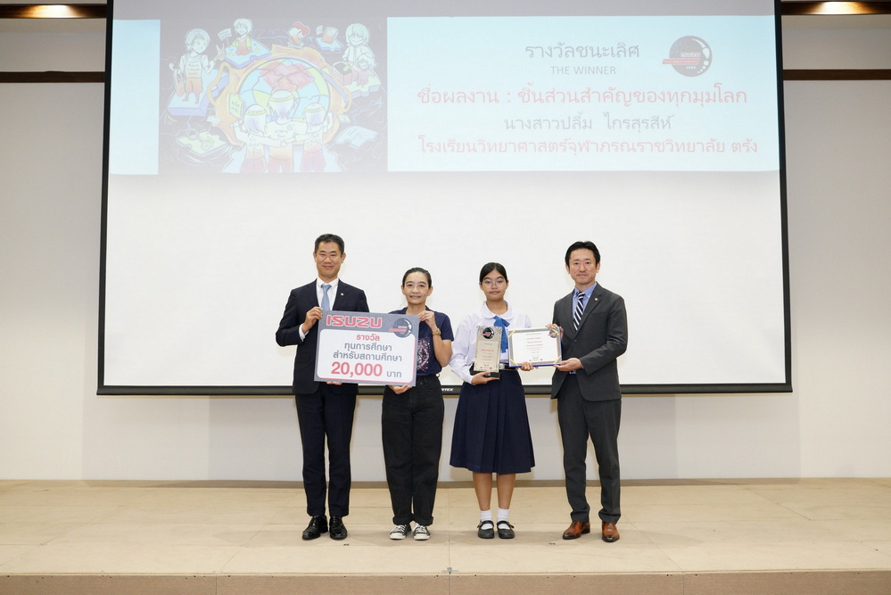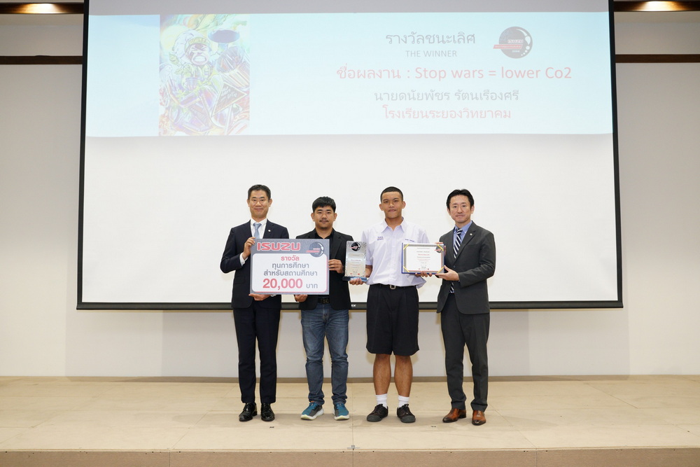 “ขอบคุณอีซูซุที่จัดกิจกรรมดี ๆ แบบนี้ วันนี้รู้สึกตื่นเต้นและสนุกมาก ๆ แล้วก็รู้สึกท้าทายด้วยที่ปีนี้มีคู่แข่งมากกว่าปีแล้ว ทุกคนมีฝีมือที่พัฒนาขึ้นและเก่งขึ้นมาก ผลงานก็ค่อนข้างหลากหลายสไตล์อีกด้วย ในปีนี้หัวข้อก็มีการปรับเปลี่ยนให้เข้ากับสถานการณ์ปัจจุบัน ซึ่งผลงานของผมมีแรงบันดาลใจจากเรื่องราวของสงครามที่สร้างมลพิษขึ้นจำนวนมาก เช่น คาร์บอนไดออกไซด์ หากหยุดสงครามก็จะช่วยทำให้มลพิษลดลงได้และทำให้โลกกลับมาเป็นปกติและอากาศดีขึ้นครับ หากเพื่อน ๆ ชอบวาดรูปก็สมัครกันเข้ามาได้นะครับ การแข่งนี้จะทำให้เก่งขึ้น เพราะต้องแข่งกับเพื่อนและแข่งกับเวลา ถือว่าเป็นการฝึกที่ดีมากเลยครับ” นายดนัยพัชร รัตนเรืองศรี โรงเรียนระยองวิทยาคม จังหวัดระยอง รางวัลชนะเลิศระดับชั้นมัธยมศึกษาตอนปลาย