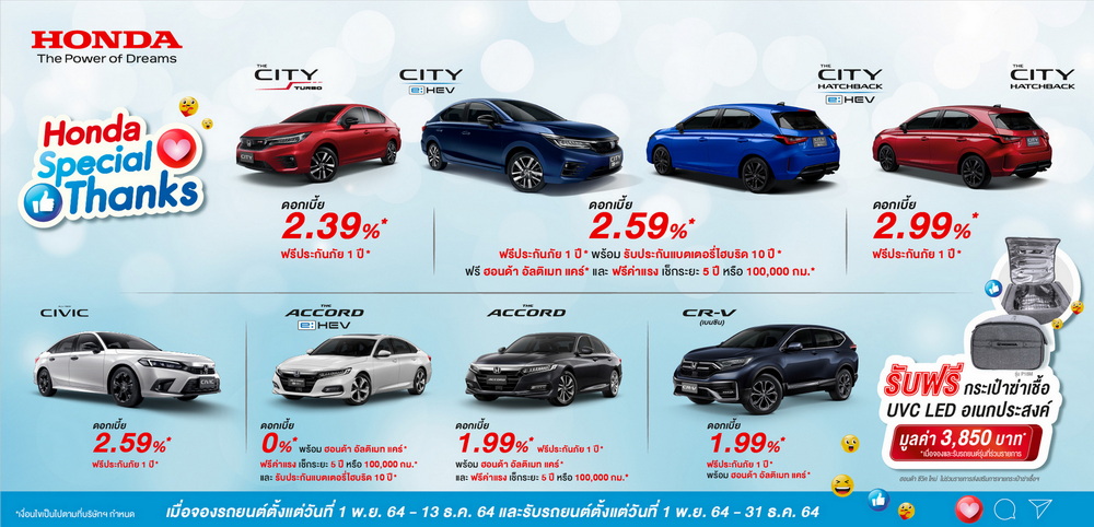 ซึ่งจะจัดแสดงที่งาน และพร้อมให้สัมผัสได้ที่โชว์รูมฮอนด้า ตั้งแต่ 2 ธันวาคม 2564 เป็นต้นไป โดยลูกค้าสามารถเลือกรับข้อเสนอ ดอกเบี้ย 2.59%* ฟรีประกันภัย 1 ปี พร้อมรับฟรีหน้ากากฟอกอากาศ LG PuriCare Gen 2 สีขาว พร้อมสายรัดหน้ากากฟอกอากาศ มูลค่า 7,080 บาท สำหรับลูกค้าที่จองและรับรถยนต์ตั้งแต่วันที่ 19 พฤศจิกายน 2564 – 31 ธันวาคม 2564 - พร้อมด้วยยนตรกรรมไฮบริด ในกลุ่มแฟมิลี่คาร์ ได้แก่ ฮอนด้า แอคคอร์ด อี:เอชอีวี และในกลุ่มซิตี้คาร์ ได้แก่ ฮอนด้า ซิตี้ อี:เอชอีวี และ ฮอนด้า ซิตี้ แฮทช์แบ็ก อี:เอชอีวี