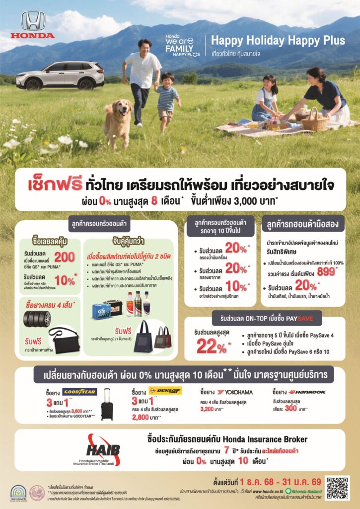 (กรุงเทพฯ – 3 ธันวาคม 2568) บริษัท ฮอนด้า ออโตโมบิล (ประเทศไทย) จำกัด เสิร์ฟความอุ่นใจส่งท้ายปีกับแคมเปญสุดพิเศษ “Happy Holiday Happy Plus! เที่ยวทั่วไทย คุ้มสบายใจ” พร้อมดูแลรถยนต์คู่ใจแบบครบวงจร สำหรับครอบครัวฮอนด้าบริการตรวจสภาพรถยนต์ฟรี* พร้อมผ่อนสบายไร้กังวล ! สำหรับงานบริการทุกประเภท ผ่อนชำระ 0% นานสูงสุด 8 เดือน* อัปเกรดความคุ้มค่า รับส่วนลดผลิตภัณฑ์ที่กำหนดมูลค่าสูงสุด 20%* สำหรับครอบครัวฮอนด้าทั้งลูกค้ารถใหม่ รถเก่า และรถมือสอง พร้อมโปรแกรมผ่อนชำระยางรถยนต์ 0% นานสูงสุด 10 เดือน* สิทธิพิเศษสุดคุ้มที่ครบ จบ ทุกความต้องการ ! เพียงนัดหมายและนำรถยนต์เข้ารับบริการที่ศูนย์บริการรถยนต์ฮอนด้าทั่วประเทศ ตั้งแต่วันที่ 1 ธันวาคม 2568 ถึง 31 มกราคม 2569