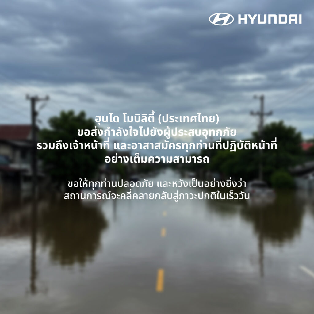 ฮุนไดหวังเป็นอย่างยิ่งว่าทุกพื้นที่ที่ได้รับผลกระทบจะฟื้นตัวกลับสู่ภาวะปกติได้ในเร็ววัน พร้อมส่งกำลังใจไปยังผู้ประสบอุทกภัยทุกท่าน รวมถึงเจ้าหน้าที่และอาสาสมัครที่ปฏิบัติหน้าที่อย่างเต็มความสามารถ ขอให้ทุกท่านปลอดภัย และผ่านเหตุการณ์ครั้งนี้ไปได้โดยเร็ว เพื่อให้สามารถกลับมาดำเนินชีวิตอีกครั้งในเร็วที่สุด