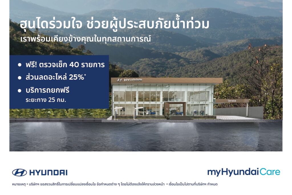 กรุงเทพฯ 27 พฤศจิกายน 2568 – ท่ามกลางสถานการณ์อุทกภัยที่ยังส่งผลกระทบต่อหลายจังหวัดในภาคใต้ ทำให้ประชาชนจำนวนมาก โดยเฉพาะผู้ใช้รถยนต์ ต้องเผชิญความเสียหายจากน้ำท่วมอย่างไม่ทันตั้งตัว บริษัท ฮุนได โมบิลิตี้ (ประเทศไทย) จำกัด ขอร่วมบรรเทาความเดือดร้อนของลูกค้าผ่านมาตรการช่วยเหลือเร่งด่วนสำหรับรถยนต์ที่ได้รับผลกระทบ ด้วยบริการตรวจเช็กสภาพรถฟรี 40 รายการ และส่วนลดค่าอะไหล่แท้ฮุนได 25% สำหรับงานซ่อมมูลค่า 50,000 บาทขึ้นไป (ไม่รวมผลิตภัณฑ์หล่อลื่นและของเหลวทุกชนิด) เพื่อลดภาระค่าใช้จ่ายและช่วยให้รถของท่านกลับมาพร้อมใช้งานได้อย่างมั่นใจ โดยทีมช่างผู้เชี่ยวชาญจะตรวจประเมินความเสียหายอย่างละเอียดตามมาตรฐานศูนย์บริการ