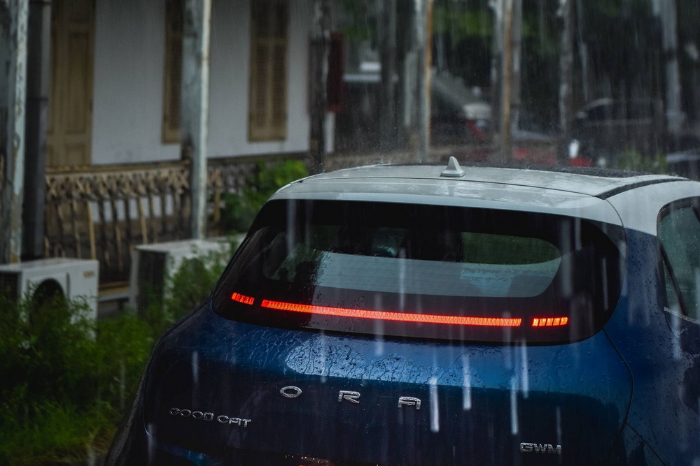 • สำหรับการขับรถในช่วงฝนตกก็ต้องระวังไม่ต่างจากการขับรถเครื่องยนต์สันดาปภายใน เช่น ควรขับรถโดยใช้ความเร็วให้เหมาะสมกับสภาพถนนเพื่อควบคุมรถบนถนนที่ลื่น และรักษาระยะห่างจากรถคันหน้ากว่าปกติ โดยรถยนต์ไฟฟ้า 100% ของ เกรท วอลล์ มอเตอร์ อย่าง ORA Good Cat ก็มีระบบช่วยเบรกฉุกเฉินบนทางตรงและทางแยกที่จะช่วยเพิ่มความปลอดภัยให้กับการขับขี่มากขึ้น นอกจากนั้น ยังมีกล่องหุ้มเซลล์แบตเตอรี่ที่แข็งแรง รองรับความปลอดภัยทางไฟฟ้า 5 ด้าน ได้แก่ การป้องกันน้ำ การกัดกร่อน การชน การกระแทก และการเกิดเพลิงไหม้ โดยหากเกิดการชนที่กระทบแบตเตอรี่ รถยนต์จะดับภายใน 50 มิลลิวินาทีเพื่อความปลอดภัย และยังมีการควบคุมอุณภูมิและการระบายความร้อนที่ดี ซึ่งช่วยป้องกันการเผาไหม้ที่อาจเกิดขึ้นเองของแบตเตอรี่ได้เช่นกัน