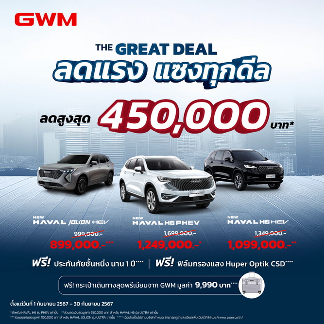 เกรท วอลล์ มอเตอร์ (ประเทศไทย) หนึ่งในผู้นำรถยนต์พลังงานใหม่ที่ขับเคลื่อนด้วยเทคโนโลยีขั้นสูงและนวัตกรรมอัจฉริยะ เดินหน้าสู่ครึ่งปีหลังของ 2567 กับความคุ้มค่าคุ้มราคาของผลิตภัณฑ์ยานยนต์พลังงานใหม่อย่างต่อเนื่อง ล่าสุด มอบข้อเสนอในราคาพิเศษที่คุ้มค่าที่สุด ภายใต้แคมเปญ “The GREAT DEAL ลดแรง แซงทุกดีล” ของทั้งเจ้าเหมียวไฮเทค GWM New ORA Good Cat ขวัญใจคนไทยทั้ง 3 รุ่น ได้แก่ รุ่น PRO, ULTRA และ GT รวมถึงรถเอสยูวีอัจฉริยะ GWM HAVAL รุ่นยอดนิยมอีก 3 รุ่น ตั้งแต่ New GWM HAVAL H6 Hybrid SUV รุ่น ULTRA, All New GWM HAVAL H6 Plug-in Hybrid SUV และ New GWM HAVAL JOLION Hybrid SUV รุ่น ULTRA ด้วยส่วนลดสูงสุดถึง 450,000 บาท ให้ชาวไทยทั่วประเทศได้เข้าถึงรถยนต์พลังงานใหม่ที่มีคุณภาพและอัดแน่นด้วยเทคโนโลยีอันทันสมัย ในราคาสุดคุ้ม ตั้งแต่วันที่ 1-30 กันยายน 2567