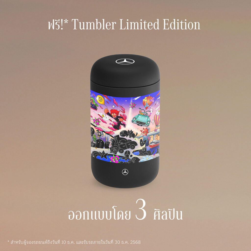 และสำหรับลูกค้าที่จองรถยนต์เมอร์เซเดส-เบนซ์ ทุกรุ่น ในงาน จะได้รับกล้อง Mercedes-Benz Drive Recorder 360° มูลค่า 16,500 บาท* และของสมนาคุณสุดพิเศษ Tumbler Limited Edition ที่ออกแบบโดยศิลปินรุ่นใหม่ทั้ง 3 ท่าน ได้แก่ “Jeff Aphisit” “Bomfha” และ