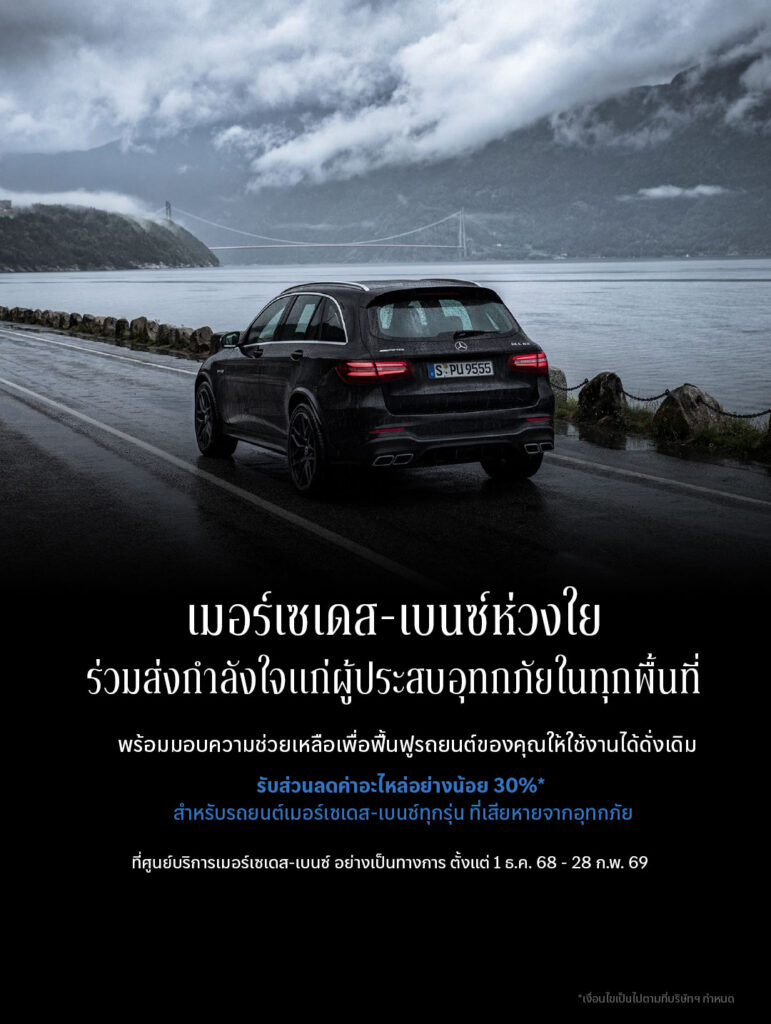 นอกจากนี้ เมอร์เซเดส-เบนซ์ พร้อมมอบส่วนลดค่าอะไหล่อย่างน้อย 30% สำหรับรถยนต์ทุกรุ่นที่ได้รับความเสียหายจากเหตุการณ์อุทกภัย เพื่อเป็นการช่วยเหลือและฟื้นฟูรถยนต์ของลูกค้าทุกคนให้กลับมาใช้งานได้ตามปกติ โดยลูกค้าที่ได้รับผลกระทบ สามารถติดต่อได้ที่ศูนย์บริการเมอร์เซเดส-เบนซ์ อย่างเป็นทางการ ตั้งแต่วันที่ 1 ธันวาคม 2568 – 28 กุมภาพันธ์ 2569