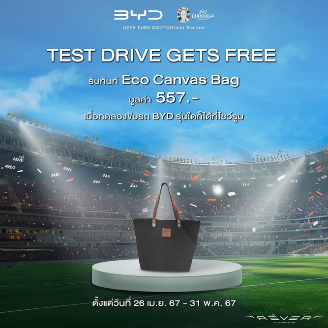 • เมื่อ Test Drive ณ โชว์รูมของ BYD รับทันที กระเป๋า Eco Canvas มูลค่ากว่า 557 บาท หรือลูกฟุตบอลยูโร สุดพรีเมียม มูลค่ากว่า 659 บาท