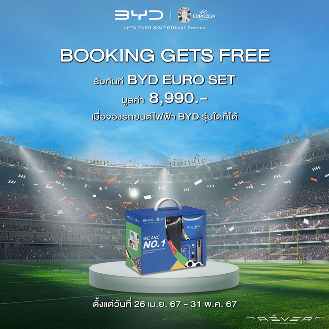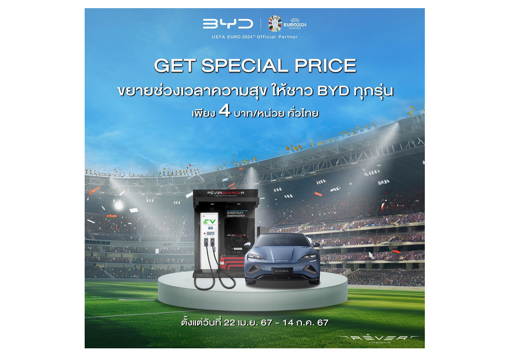 บริษัท เรเว่ ออโตโมทีฟ จำกัด ผู้จัดจําหน่ายและให้บริการหลังการขายรถยนต์พลังงานไฟฟ้า BYD อย่างเป็นทางการในประเทศไทย พร้อมเดินหน้าขับเคลื่อนการเปลี่ยนประเทศไทยสู่สังคมยานยนต์ไฟฟ้าและความเป็นกลางทางคาร์บอน และในโอกาสเทศกาลการแข่งขันฟุตบอลยูโร 2024 ที่มาถึงนี้ ทาง BYD ได้มีโอกาสเป็นผู้สนับสนุนหลักอย่างเป็นทางการ เรเว่ฯ จึงขอส่งมอบความพิเศษด้วยแคมเปญ BYD Euro Privilege สุดยิ่งใหญ่ต้อนรับยูโร 2024 รับถึง 3 ต่อ มอบสิทธิประโยชน์สุดคุ้มค่าให้แก่ผู้ใช้ BYD ทุกท่าน เพียงชวนเพื่อนหรือคนรู้จักซื้อรถยนต์ไฟฟ้า BYD ทุกรุ่น รับฟรี! 30,000 เครดิตสำหรับชาร์จรถไฟฟ้า ณ จุดชาร์จของ RÊVERSHARGER รวมถึงชุดของสมนาคุณสุดเอ็กซ์คลูซีฟ ลิขสิทธิ์แท้ UEFA EURO 2024 อีกมากมาย โดยเครดิตที่ได้ยังสามารถใช้ร่วมกับโปรโมชัน Plug and Charge ชาร์จไฟอย่างจุใจได้ในราคาเพียง 4 บาท/หน่วย ซึ่งขยายโปรโมชันไปจนถึง 14 กรกฎาคมนี้ได้อีกด้วย ผู้ที่สนใจสามารถเข้าร่วมแคมเปญได้ตั้งแต่วันที่ 1 พฤษภาคม – 14 กรกฎาคม 2567