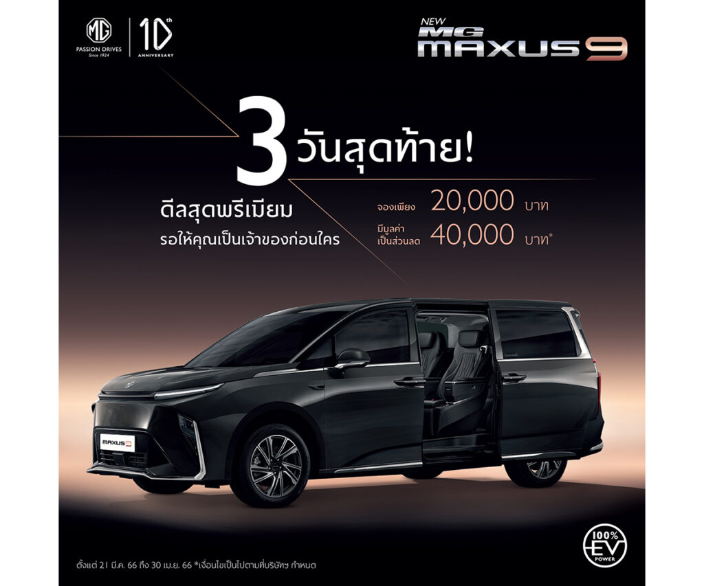 บริษัท เอสเอไอซี มอเตอร์ – ซีพี จำกัด และ บริษัท เอ็มจี เซลส์ (ประเทศไทย) จำกัด ผู้ผลิตและผู้จำหน่ายรถยนต์เอ็มจีในประเทศไทย ประกาศเข้าสู่ช่วงโค้งสุดท้ายของการเป็นเจ้าของ NEW MG MAXUS 9 รถลักชัวรี่ e-MPV แบบ 7 ที่นั่ง ที่ขับเคลื่อนด้วยพลังงานไฟฟ้า 100% ก่อนใคร พร้อมรับข้อเสนอพิเศษ จองเพียง 20,000 บาท จะมีมูลค่าเป็นส่วนลด 40,000 บาท สำหรับผู้ที่สนใจยังสามารถจองผ่านทางเว็บไซต์ https://www.mgcars.com , MG Thailand แอพพลิเคชัน และโชว์รูมเอ็มจี ตั้งแต่วันนี้ – 30 เมษายน 2566 โดยทาง เอ็มจี ปักหมุดเตรียมประกาศราคาจำหน่าย NEW MG MAXUS 9 อย่างเป็นทางการในวันที่ 2 พฤษภาคม 2566 เวลา 9.00 น. ผ่านทุกช่องทางการสื่อสารของ เอ็มจี