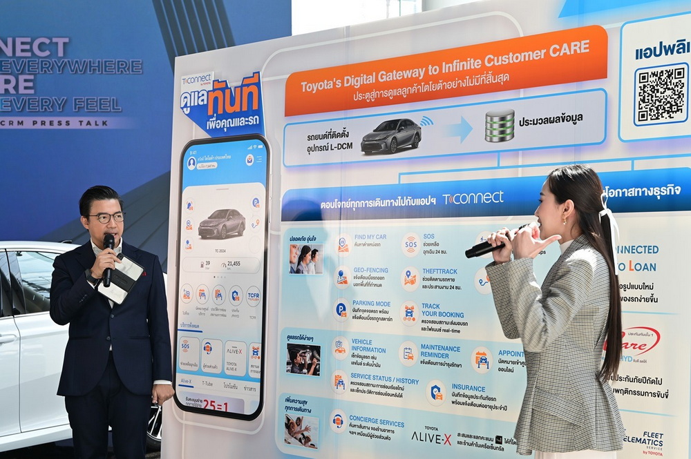 นายศุภกร รัตนวราหะ รองกรรมการผู้จัดการใหญ่ บริษัท โตโยต้า มอเตอร์ ประเทศไทย จำกัดพร้อมด้วย นายศุภชัย สินสุวรรณรักษ์ ผู้ช่วยกรรมการผู้จัดการใหญ่ และนายรุ่งโรจน์ ขันชะลี ผู้ช่วยกรรมการผู้จัดการใหญ่ ตอกย้ำความเป็นผู้นำด้านการขับเคลื่อน ที่พร้อมเชื่อมต่อทุกประสบการณ์แบบครบวงจรในยุคดิจิทัล ครอบคลุมตลอดการใช้รถของโตโยต้า พร้อมแนะนำบริการใหม่ Connect You บริการแจ้งสิทธิพิเศษให้ลูกค้าเฉพาะบุคคลผ่านแอปพลิเคชัน T-CONNECT และเปิดตัว Service Loyalty Program อย่างเต็มรูปแบบ ภายใต้ชื่อ “TCFR Plus+” ตอบแทนลูกค้าคนสำคัญที่เข้ารับบริการเช็กระยะกับศูนย์บริการโตโยต้าอย่างต่อเนื่อง รับสิทธิขยายระยะรับประกันคุณภาพรถยนต์สูงสุด 8 ปี พร้อมสิทธิประโยชน์อื่นๆที่ครอบคลุมตลอดการใช้ ภายในงานแถลงข่าว “CONNECT EVERYWHERE, TAKE CARE EVERY FEEL: เชื่อมต่อการขับขี่ ขับเคลื่อนความห่วงใย” ณ Toyota ALIVE บางนา
