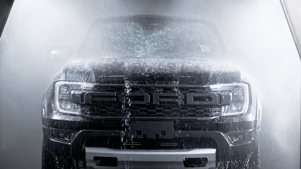 - หนึ่งในขั้นตอนสำคัญของการทดสอบคุณภาพรถ คือการทดสอบด้วยน้ำ ซึ่งรถฟอร์ด เรนเจอร์ทุกคันจะถูกฉีดน้ำแรงดันสูงทุกทิศทาง เพื่อจำลองสถานการณ์พายุฝนกระหน่ำแบบที่รุนแรงที่สุดเท่าที่จะจินตนาการได้ หลังจากปิดพลังน้ำแรงดันสูงแล้ว ทีมงานจะต้องตรวจสอบทุกรายละเอียด เริ่มจากการตรวจด้วยสายตาเพื่อให้แน่ใจว่ากรอบไฟหน้า ไฟท้าย และไฟตัดหมอก ไม่มีน้ำรั่วซึมเข้าไป นอกจากนี้ น้ำที่ใช้ในการทดสอบจะไม่ถูกปล่อยทิ้งไปโดยเปล่าประโยชน์ แต่จะถูกระบายลงพื้นและเข้าสู่กระบวนการเพื่อนำกลับมาใช้ซ้ำในการทดสอบครั้งต่อไป จากนั้นทีมงานจึงเปิดประตูรถทุกบาน และตรวจเช็คขอบยางว่ามีน้ำซึมเข้าไปหรือไม่ และจะใช้เครื่องมือพิเศษตรวจสอบเพิ่มเติมเพื่อให้มั่นใจว่าพรมในห้องโดยสารแห้งสนิท โดยเครื่องมือนี้จะส่งสัญญาณแจ้งเตือนเมื่อตรวจพบความชื้น