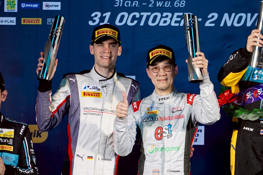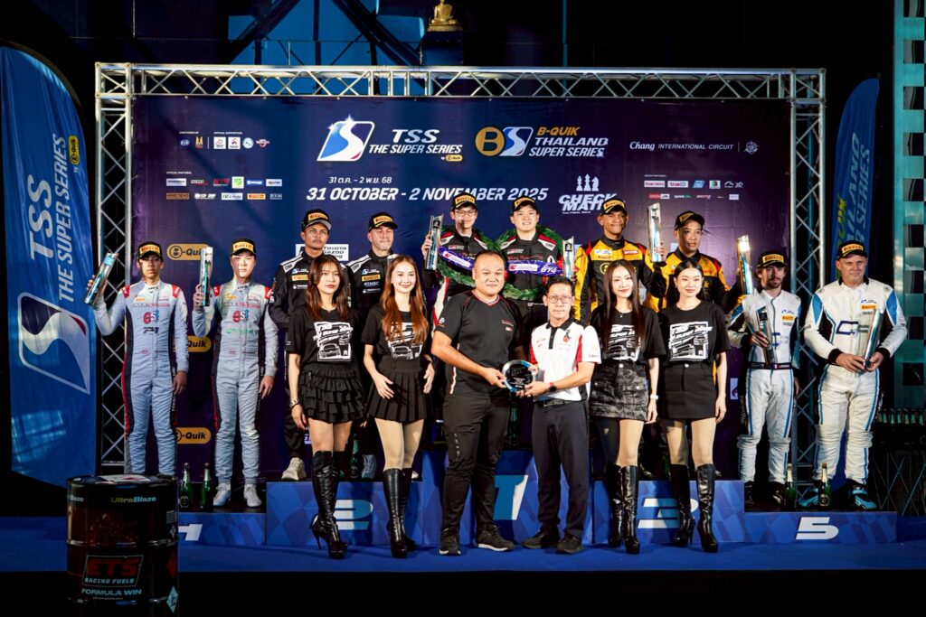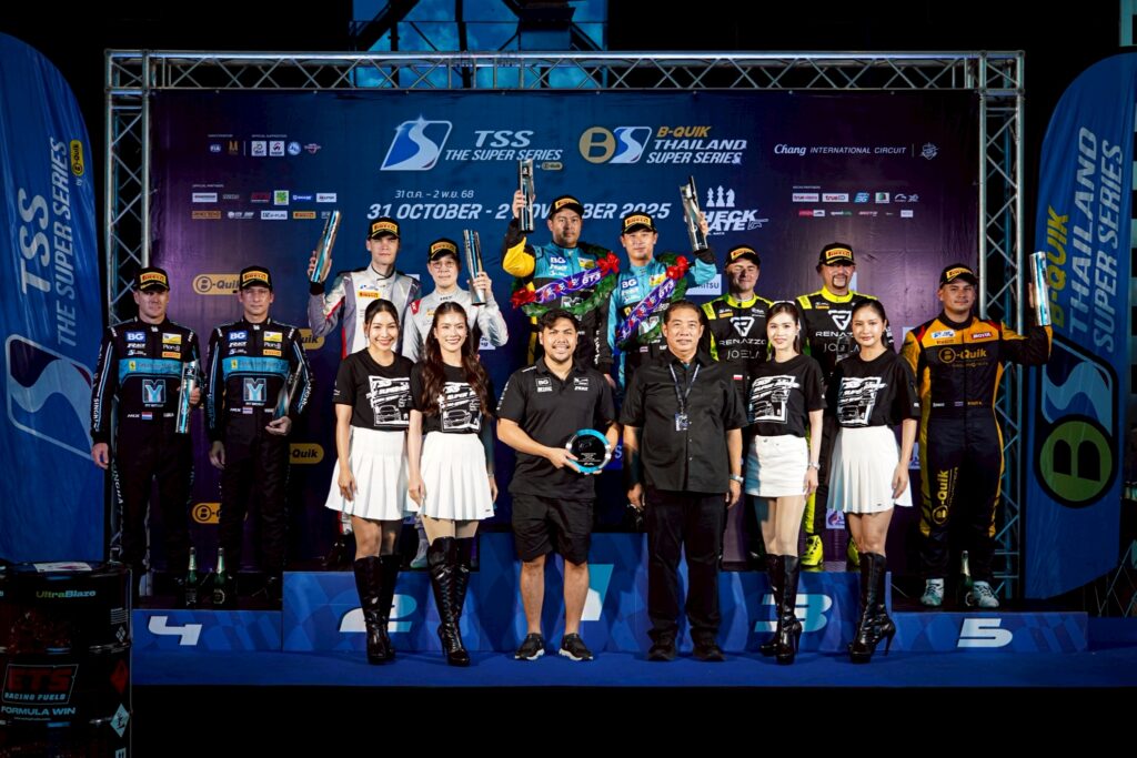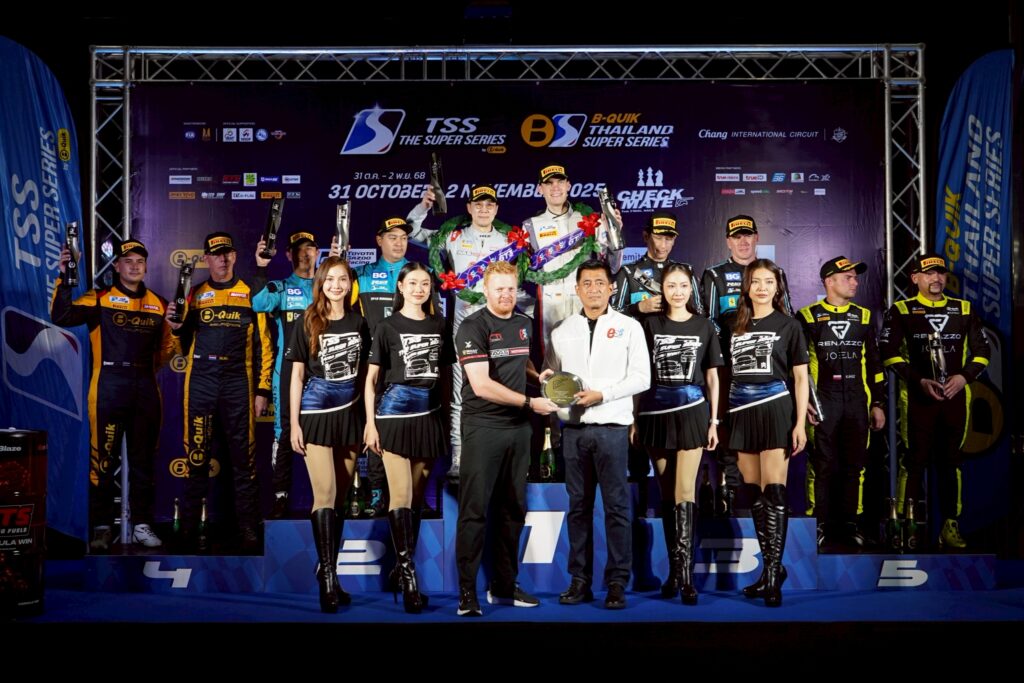 ประเดิมความมันส์กันด้วยรุ่น Supercar GT3 พี่ใหญ่สุดของรายการ ที่ได้สองนักแข่งฝีมือฉกาจอย่าง “เต๊อะ วุฒิกร” และ “ลอริน ไฮน์ริช” โชว์ฟอร์มสุดเฉียบสร้างผลงานตั้งแต่รอบซ้อมจนถึง Qualifying โดยในรอบจัดอันดับ “เต๊อะ วุฒิกร” สามารถคว้าตำแหน่ง Pole มาครองได้สำเร็จ ขณะที่ทีมเมท “ลอริน ไฮน์ริช” ทำเวลาเร็วที่สุดเป็นอันดับที่ 3 และนั่นทำให้การแข่งขันใน (Race 9) เข้าทาง 2 นักแข่งหมายเลข 18 ทันทีที่สัญญาณสตาร์ทดังขึ้น “เต๊อะ วุฒิกร” ซึ่งออกสตาร์ทจากตำแหน่งโพลสามารถทำความเร็วและรักษาอันดับจ่าฝูงเอาไว้ได้ม้วนเดียวจบ ก่อนส่งต่อให้ “ลอริน ไฮน์ริช” ปิดจ็อบการแข่งขันแบบไร้ที่ติ ขึ้นโพเดียมรับถ้วยรางวัลชนะเลิศ (P1) เก็บ 25 แต้มสำคัญเข้าตารางแชมเปี้ยนชิพ รั้งตำแหน่งผู้นำในคลาส จีที 3 ไว้ได้อย่างสมบูรณ์แบบ แม้ผลการแข่งขันใน (Race 10) หลังจาก ลอริน ไฮน์ริช ออกสตาร์ทจากกริดที่ 3 จะจบเกมไปในอันดับที่ 2 แต่นั่นก็ยังทำให้คะแนนรวมของทั้งคู่ครองตำแหน่ง “แชมป์ประจำปี 2025” ในรุ่น Supercar GT3 เอาไว้ได้อย่างเหนียวแน่น ทิ้งทวนฤดูการแข่งขันได้อย่างสมภาคภูมิ