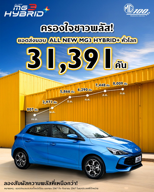 - ALL NEW MG3 HYBRID+ การันตีความเชื่อมั่นด้วยรางวัลชั้นนำ อาทิ รถยนต์ที่มอบความคุ้มค่าที่สุด “Affordable Car of the year 2024” จาก Auto Express UK และ “รางวัล Best Value Car” จาก The Business Car Awards ในสหราชอาณาจักร พร้อมยอดขายที่เพิ่มขึ้นอย่างต่อเนื่องตั้งแต่เดือนเมษายนจนถึงเดือนกันยายน รวมกว่า 32,000 คัน ทั้งยังเป็นรถยนต์ที่ผ่านคุณสมบัติและหลักเกณฑ์ในการเข้ารับคัดเลือกรอบแรก และได้รับการคัดเลือกเป็น 1 ใน 5 รุ่น ให้เข้าสู่รอบสุดท้ายของการตัดสิน รถยนต์ยอดเยี่ยมประจำปี 2567 (THAILAND CAR OF THE YEAR 2024) โดยสมาคมผู้สื่อข่าวรถยนต์และรถจักรยานยนต์ไทย – สรยท. (THAI AUTOMOTIVE JOURNALISTS ASSOCIATION – TAJA)