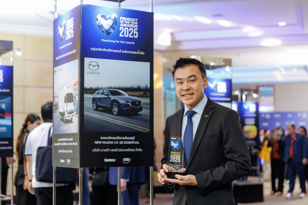 กรุงเทพฯ – ประเทศไทย, 14 ตุลาคม 2568 – ครอสโอเวอร์เอสยูวีระดับพรีเมี่ยม New Mazda CX-30 Essential คว้ารางวัล Product of the Year Awards 2025 หรือรางวัลสุดยอดสินค้าและบริการแห่งปี จากนิตยสาร Business+ ที่จัดขึ้นเพื่อคัดเลือกสุดยอดสินค้าและบริการแห่งปี ที่ตอบสนองความต้องการของลูกค้า มีความโดดเด่น และสร้างความพึงพอใจให้กับลูกค้า ตอกย้ำถึงแนวทางของบริษัทฯ ต่อการมุ่งมั่นพัฒนานวัตกรรมและเทคโนโลยียานยนต์อันล้ำสมัย ตอบสนองความต้องการของลูกค้าที่มีไลฟ์สไตล์หลากหลาย และส่งมอบประสบการณ์ความสุขในการขับขี่ให้กับลูกค้าได้เป็นอย่างดี โดยพิธีมอบรางวัลครั้งนี้ ได้รับเกียรติจาก ฯพณฯ นุรักษ์ มาประณีต องคมนตรี เป็นประธานมอบรางวัล โดยมี นายภพนิพิฐ จิรวัฒนานนท์ ผู้อำนวยการ ฝ่ายการตลาดและนวัตกรรมดิจิทัล บริษัท มาสด้า เซลส์ (ประเทศไทย) จำกัด เป็นตัวแทนรับมอบฯ ณ ห้องบอลรูม โรงแรมสวิสโฮเต็ล รัชดา กรุงเทพฯ