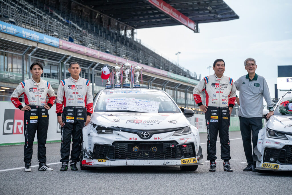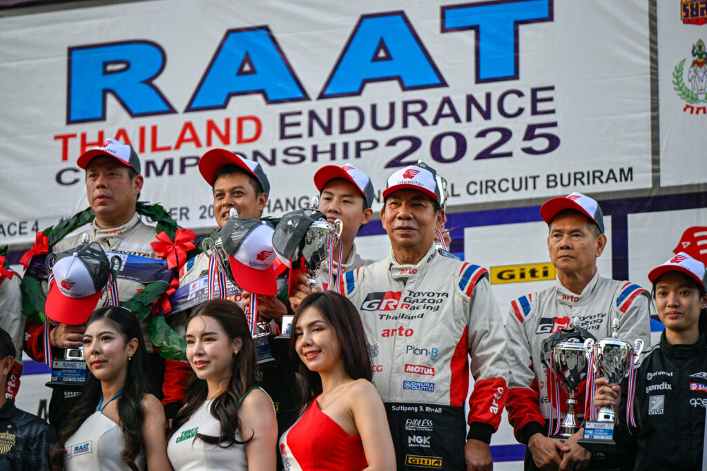 “TOYOTA GAZOO Racing Thailand” ทีมแข่งรถที่ยิ่งใหญ่และประสบความสำเร็จอย่างสูงของวงการมอเตอร์สปอร์ต ภายใต้การสนับสนุนของบริษัท โตโยต้า มอเตอร์ ประเทศไทย จำกัด ปิดฉากการแข่งขัน “RAAT Thailand Endurance Championship 2025” อย่างยิ่งใหญ่ หลังฝ่าด่านพิสูจน์ความแกร่งของทั้งรถและคนยาวนาน 8 ชม. จบสวยคว้าถ้วยอันดับ 1 ครองตำแหน่งแชมป์ประเทศไทยถ้วยพระราชทานฯ 4 ปีซ้อนไปแบบสมศักดิ์ศรี ในศึกสุดท้ายสนาม 4 ระหว่างวันที่ 11-12 ตุลาคม 2568 ณ สนามช้าง อินเตอร์เนชั่นแนล เซอร์กิต จ.บุรีรัมย์